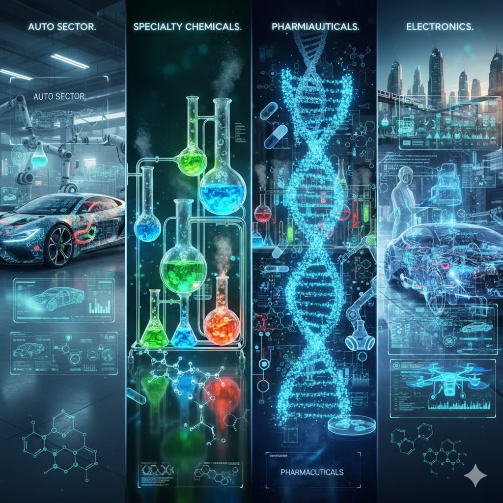 സെമികണ്ടക്ടറുകൾ, ഇലക്ട്രോണിക് ഉൽപ്പന്നങ്ങൾ, വ്യാവസായിക ഹാർഡ്‌വെയറുകൾ എന്നിവയുടെ ഉൽപ്പാദനത്തിനും കയറ്റുമതിക്കും ഈ മേഖലയിൽ വലിയ സാധ്യതകളുണ്ട്.ഓട്ടോമൊബൈൽസ്, ഓട്ടോ-കോമ്പണൻ്റ്സ് നിലവിൽ, വാഹന നിർമ്മാണത്തിൽ ലോകത്ത് നാലാം സ്ഥാനത്താണ് ഇന്ത്യ. ജിഡിപിയിലേക്ക് ഏകദേശം 7.1% സംഭാവന ചെയ്യുന്നത് ഈ മേഖലയാണ്. ഓട്ടോ കോമ്പണൻ്റ്സ് വ്യവസായം കഴിഞ്ഞ വർഷം 11% വളർച്ച നേടി, 2030-ഓടെ കയറ്റുമതിയിൽ 120 ബില്യൺ ഡോളർ ലക്ഷ്യമിടുന്നു. മദർസൺ സുമി പോലുള്ള കമ്പനികൾ ആഗോള നിലവാരത്തിലുള്ള ഉൽപ്പന്നങ്ങൾ നിർമ്മിച്ച് ഈ രംഗത്ത് പുതിയ മാതൃകകൾ സൃഷ്ടിക്കുന്നു.